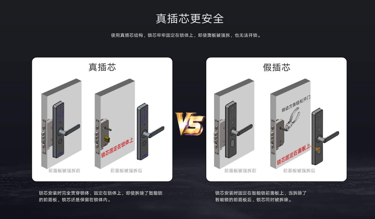 真插芯安装时完全贯穿锁体,固定在锁体上,即使小偷采取暴力手段拆除指纹锁的前面板,锁芯还是保留在锁体内;C级锁芯技术开锁需要270分钟以上,暴力开锁需要30分钟以上,小偷也只能望门兴叹了。