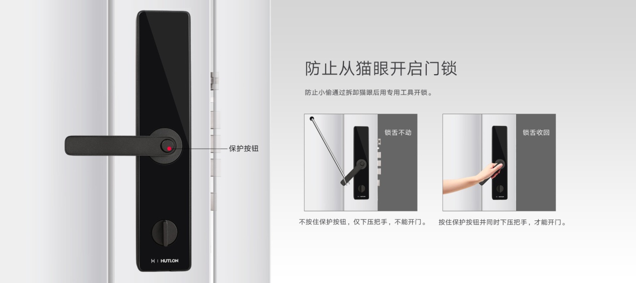 现在有很多小偷会通过拆卸猫眼后用专用工具开锁。智选智能指纹锁在室内面板把手上设计了保护按钮,不按住保护按钮,仅下压把手不能开门,按住保护按钮并同时下压把手才能开门,防止小偷通过猫眼孔开门。