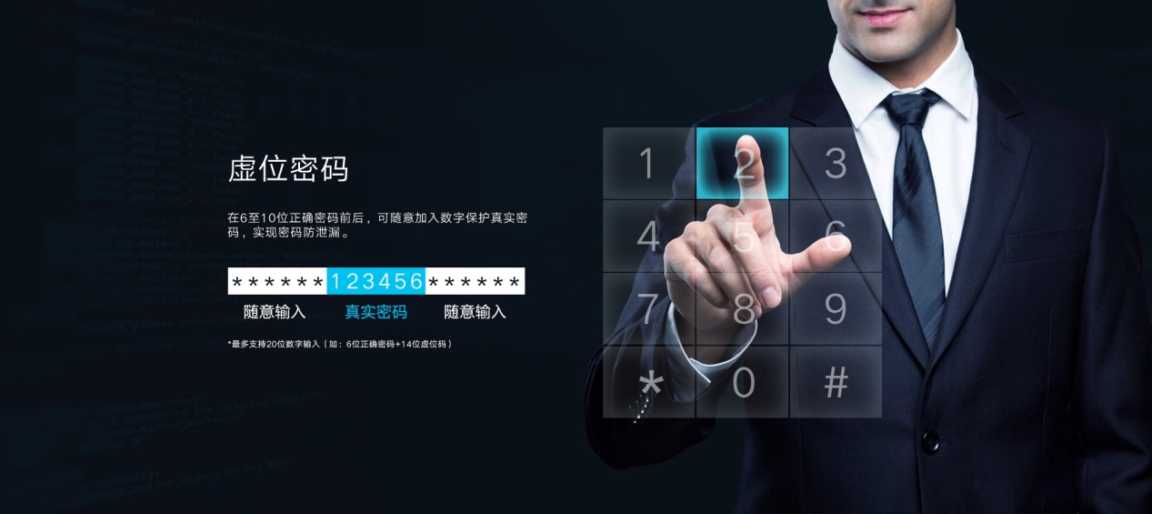 有时候需要用密码开锁,旁边又刚好有人,这时候该怎么办?不用担心!尽管用密码开锁,虚位密码功能,让我们可以在6位正确密码前后,随意加入数字保护真实密码,最多支持20位数字输入(6位正确密码+14位虚位码),实现密码防泄漏。