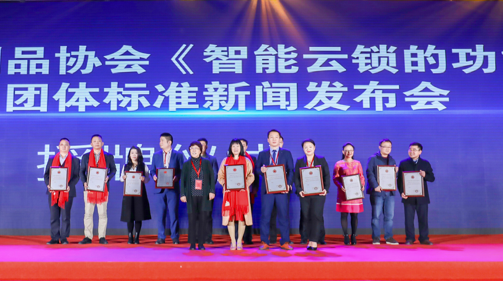 ▲中国五金制品协会理事长石僧兰女士为《智能云锁的功能要求》的团体标准各起草单位进行授牌