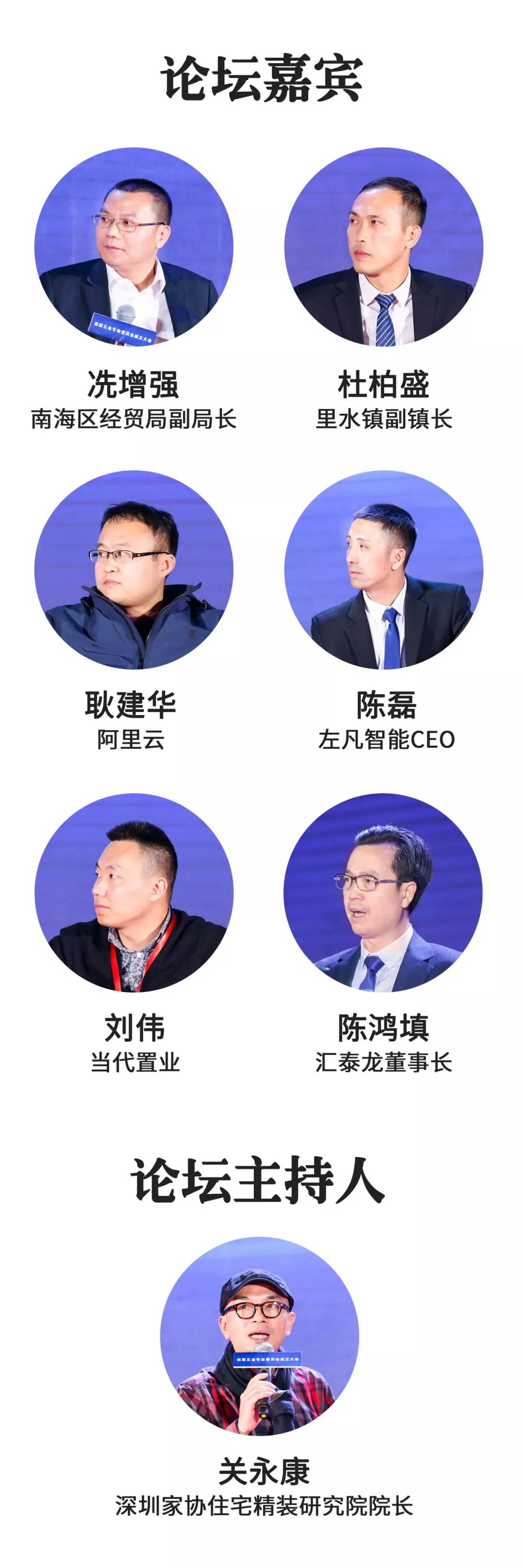 南海区经贸局副局长冼增强先生、里水镇副镇长杜柏盛先生、住宅精装研究院院长关永康先生、阿里云耿建华先生、左凡智能CEO陈磊先生、当代置业刘伟先生、汇泰龙董事长陈鸿填先生出席本次里水智能家居小镇崛起与发展高峰论坛。