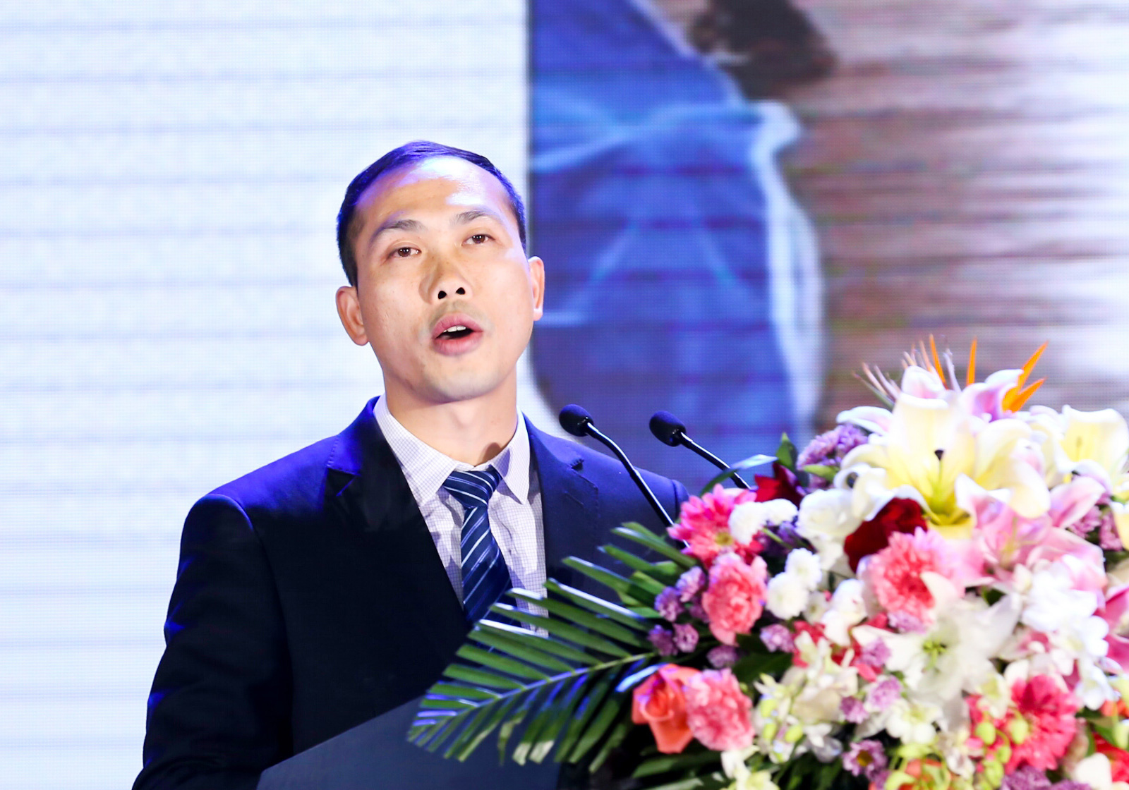 ▲广东省佛山市南海区政府代表、里水镇杜柏盛副镇长发表“南海里水的投资环境”主题演讲