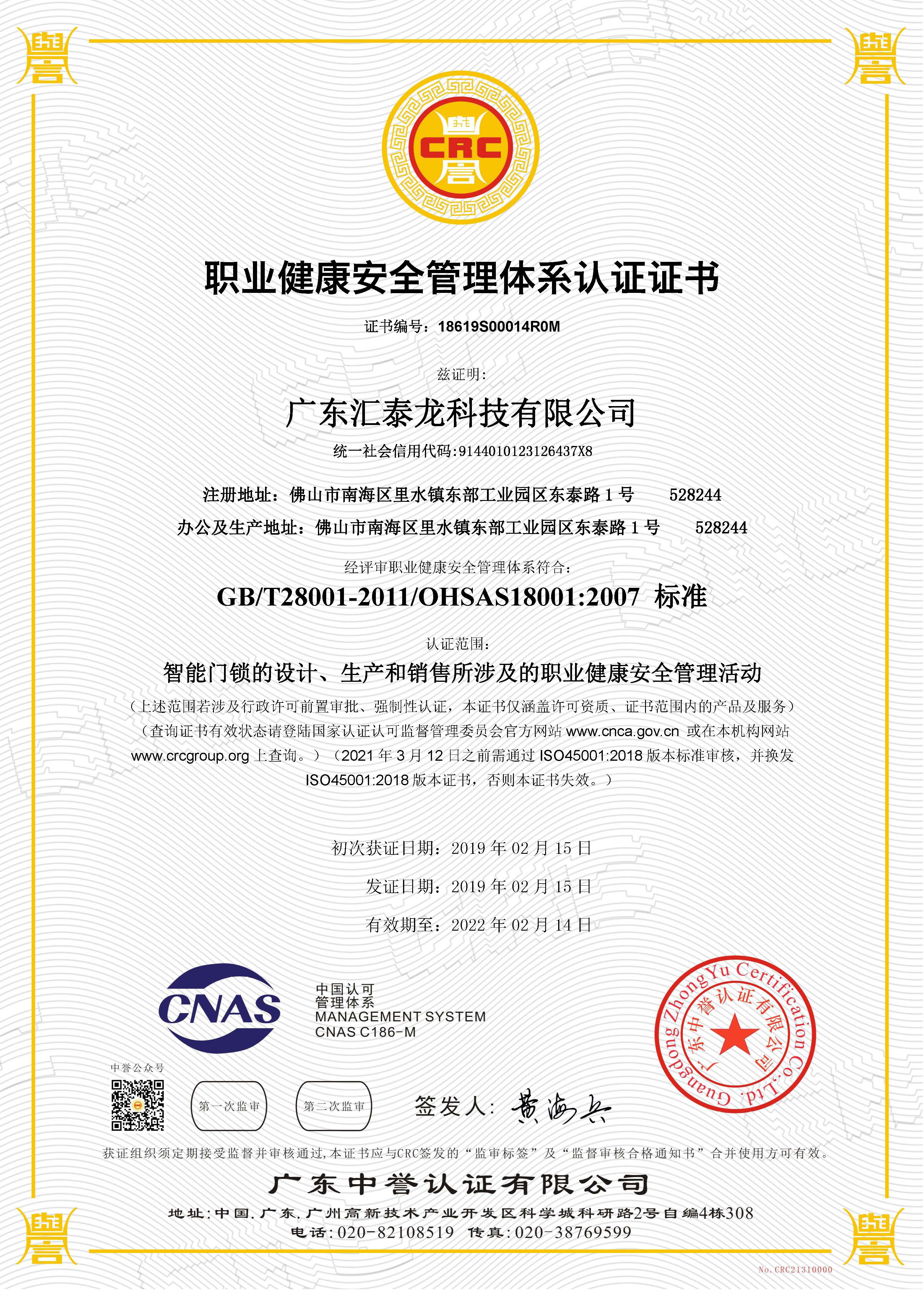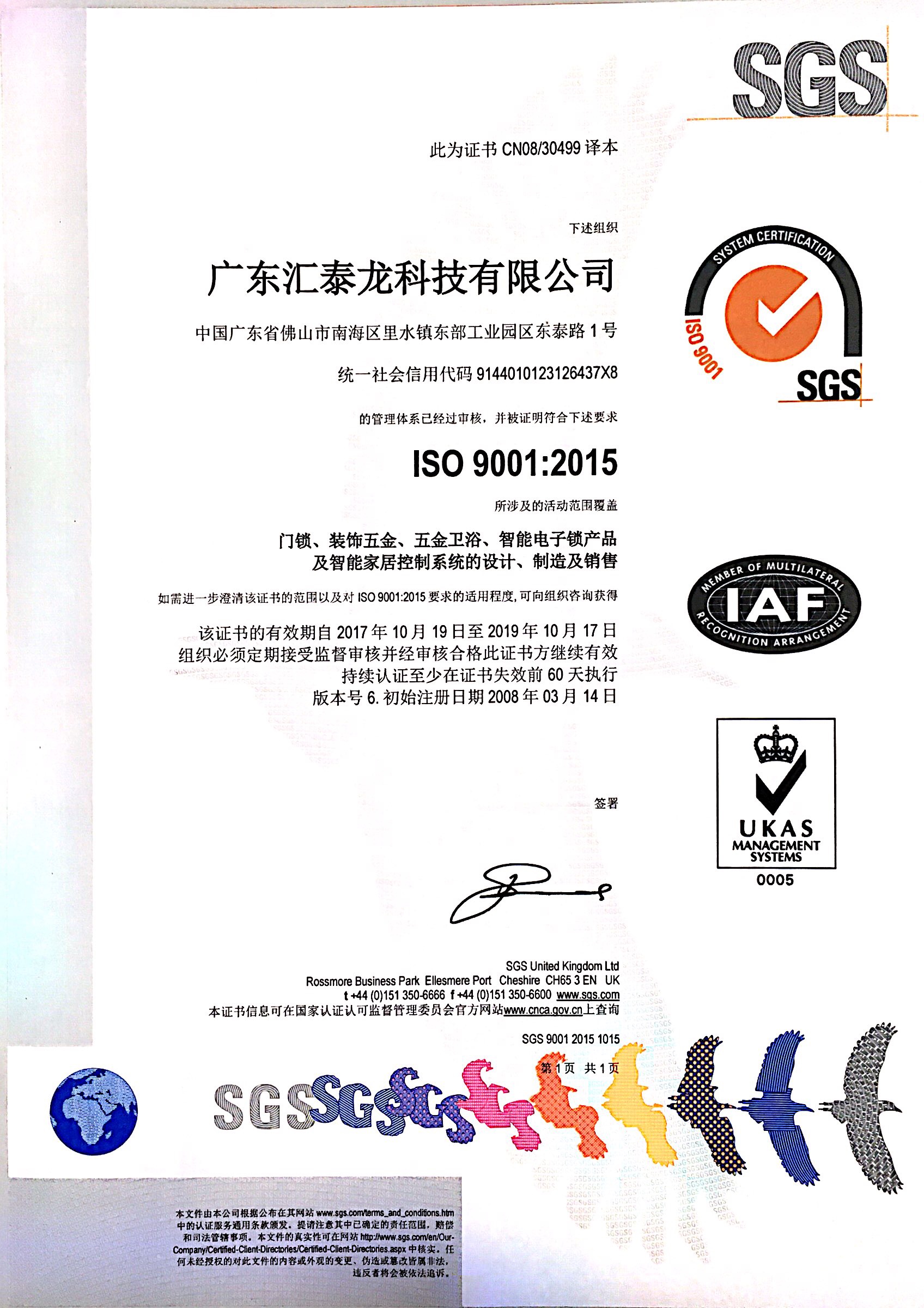 现今,汇泰龙通过并采用ISO9001质量管理体系、ISO14001环境管理体系、OHSAS18001职业健康安全管理体系、CNAS检测和校准实验室能力认可准则和GB/T29490知识产权管理体系等多项高标准体系认证,规范化管理,确保为用户提供智能生活五金全系统解决方案,一站式供货,五星级服务。