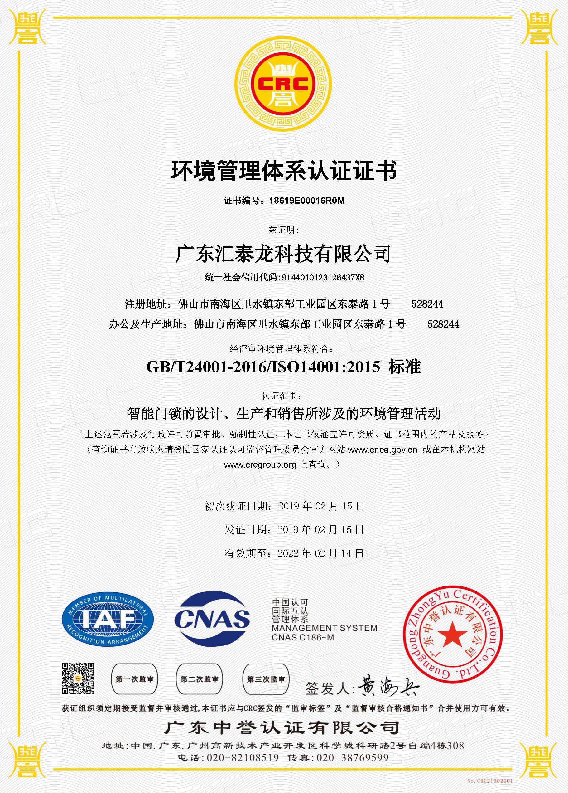 环境是人类赖以生存的条件,关系到人类可持续性发展。良好的环境管理有利于企业的可持续及长足发展,亦是企业承担社会责任的体现。2019年,汇泰龙通过GB/T24001-2016/ISO14001:2015环境管理体系认证,在环境管理方面更上一个台阶。