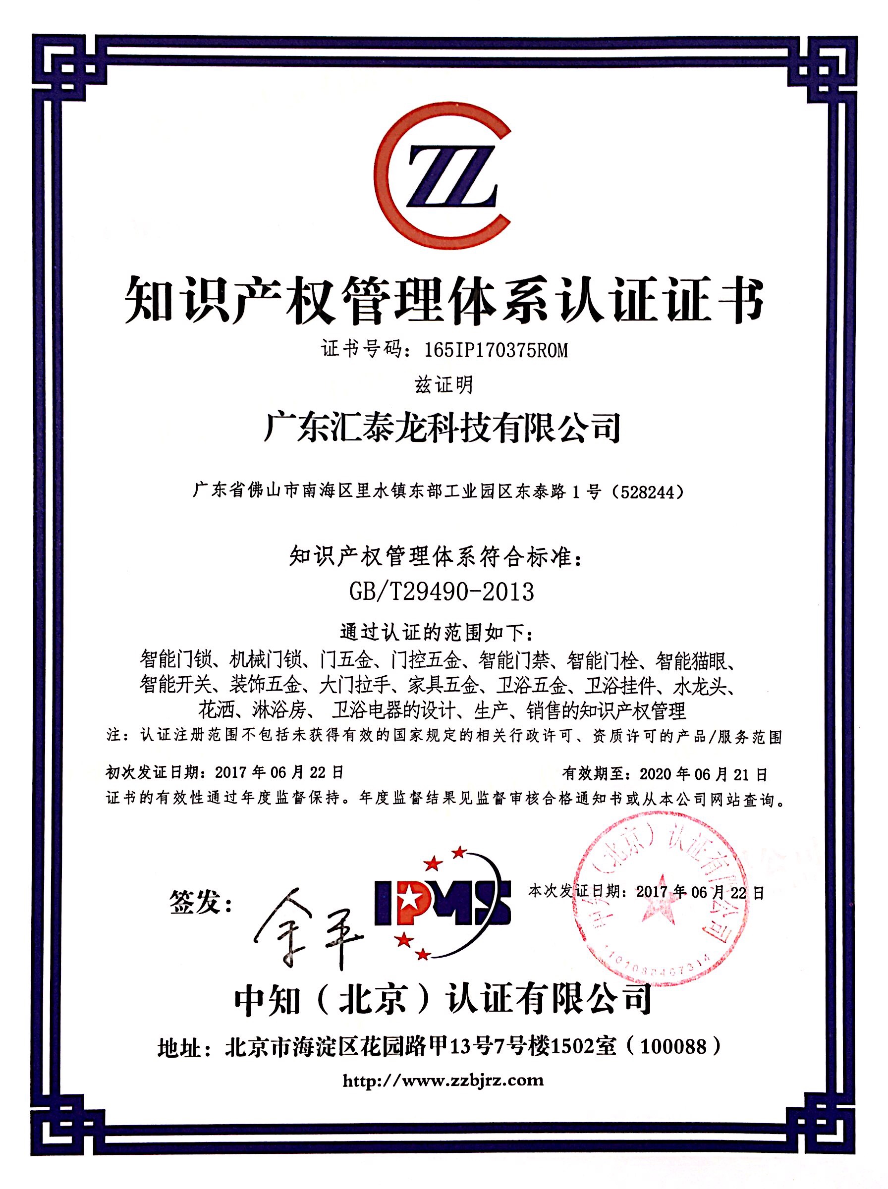 汇泰龙“匠心智造,永恒品质”,2017年,汇泰龙通过GB/T29490-2013知识产权管理体系认证,规范化、体系化管理汇泰龙知识产权,提升汇泰龙自主研发实力以及知识产权竞争力。