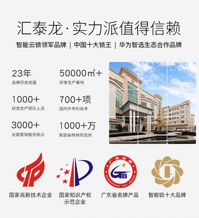 与此同时,为提升消费者的智能、安全的生活体验,汇泰龙建立多个研发基地,研发团队超百人,驱动产品不断创新进步,荣获“国家知识产权示范企业”。