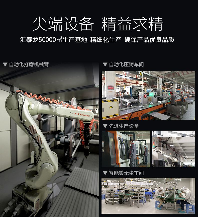 为确保产品优良品质,汇泰龙拥有50000㎡现代化生产基地,配备抛光除尘系统的全自动抛光设备、机械臂打磨、冲压、压铸等大批现代化生产设备。