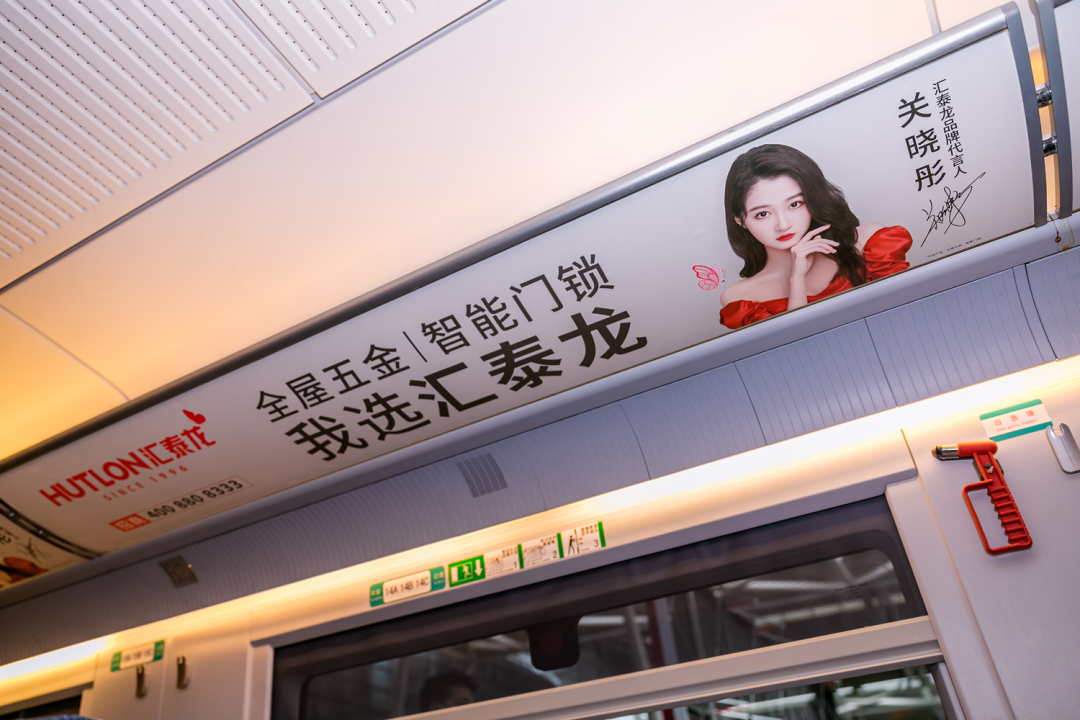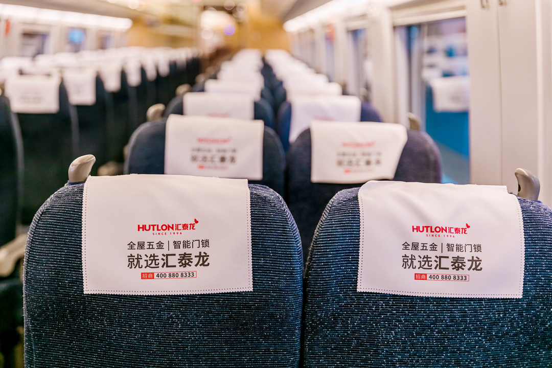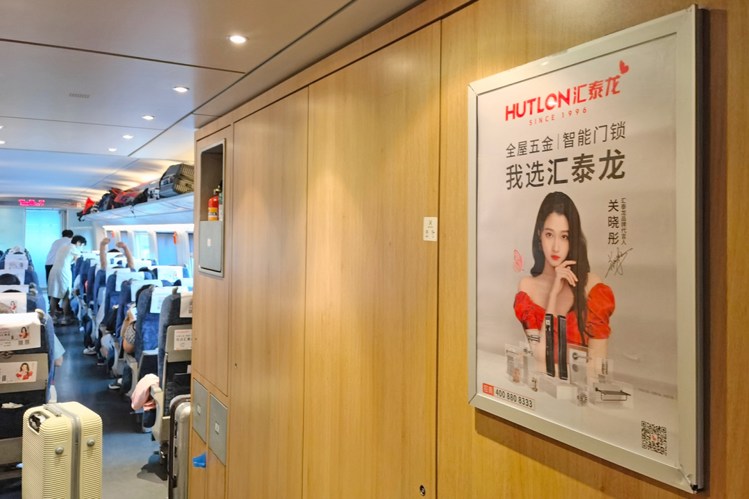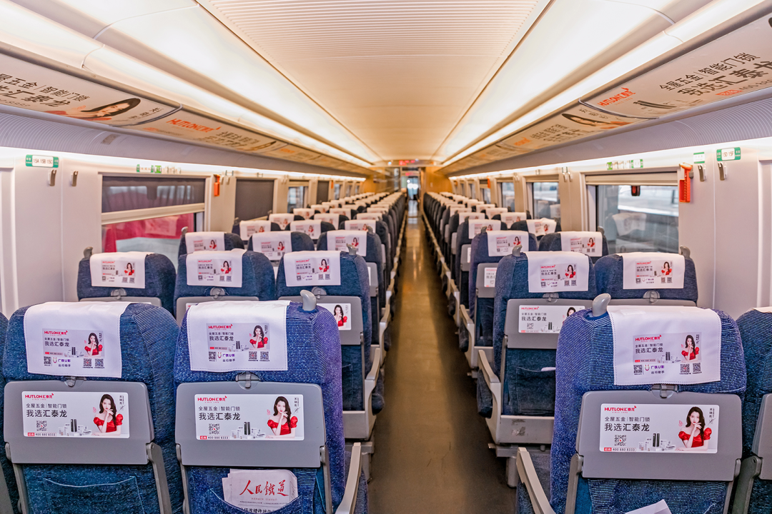 车厢内,报站语音广播广告、以及汇泰龙品牌代言人关晓彤KV广告遍布在门贴、海报、头枕、桌板、品牌长廊、LED字幕等车内多元化、视听结合的全媒体广告,多方位、高频次传播“全屋五金丨智能门锁 我选汇泰龙”,构建起汇泰龙品牌专属的全方位传播空间,也是穿梭在祖国大地上一道靓丽的品牌风景线。