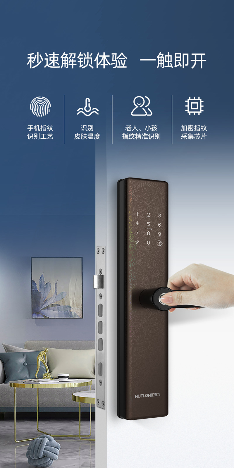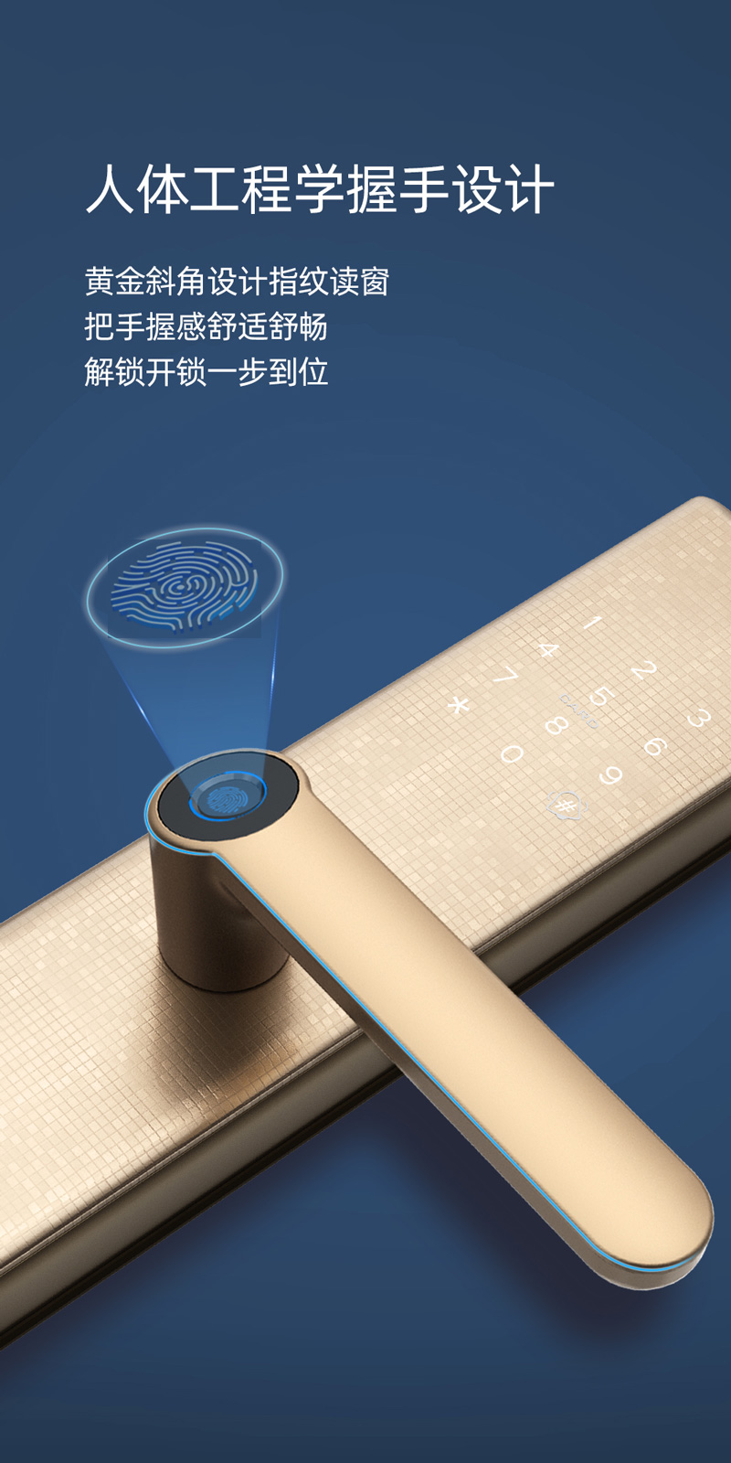 .半导体指纹头设计在把手上,识别率高,识别速度快,指纹识别和下压把手一步开门